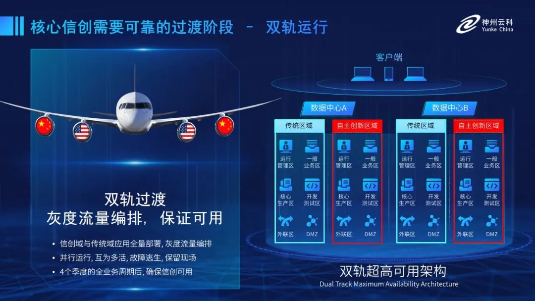 为帮助客户更好地应对数字经济时代对应用可持续性的高要求,实现信创与数字化兼得,星空xk官网推出了双轨超高可用架构。双轨超高可用架构在双活数据中心的分区调度基础上,增加信创域和非信创域的分域调度,实行信创域与传统域应用全量部署,使双中心运营变为双中心四区域并行运行,互为多活,将传统架构变为分区分域协同的多活双轨超高可用架构。帮助客户在新架构下,保障“信创”的同时解决性能瓶颈,提升稳定性,保证应用可持续性,最终实现信创区域和非信创区域的平滑过渡,完成国产化替代目标。”